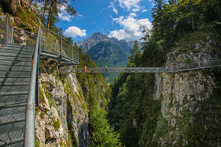 Der neu erbaute Klammsteig über der Leutaschklamm bei Mittenwald verläuft u. a. auf einem kühnen, 800 m langen Steg. Der Klammgeist erzählt Geheimnisvolles aus seinem Reich.