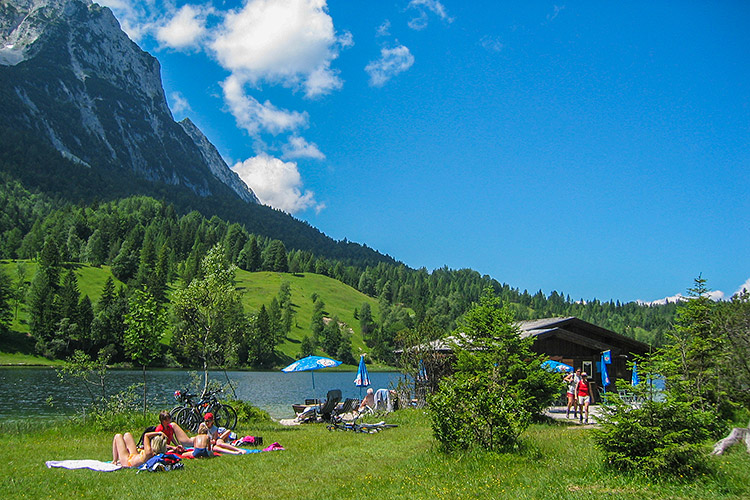 Blick auf Strandbad am Lautersee und Karwendelgebirge