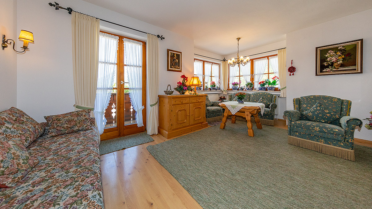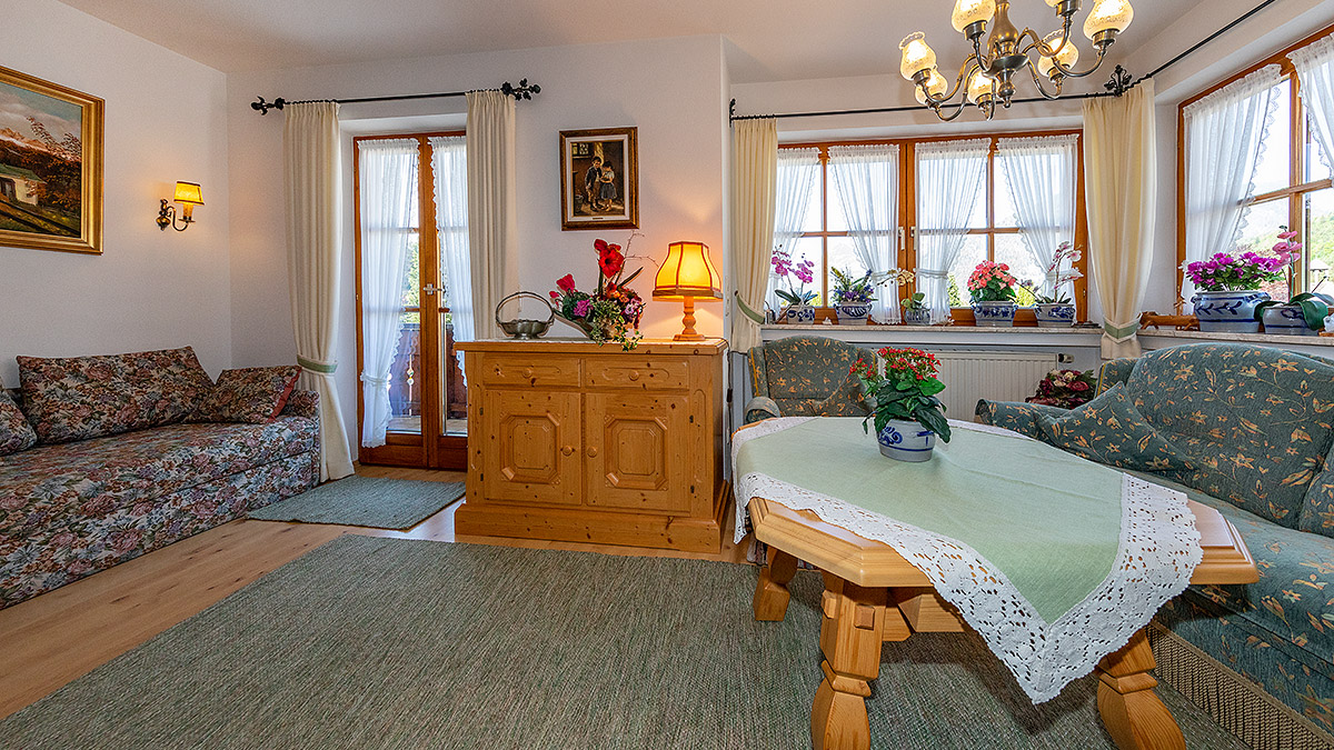 Unsere Ferienwohnung Soiern für 1 - 4 Personen besteht aus Wohnzimmer, vollausgestatteter Wohnküche mit Backofen, Schlafzimmer, Bad/WC und 2 Balkone mit Blick zum Karwendel. Schlafgelegenheit für 3. und 4. Person.