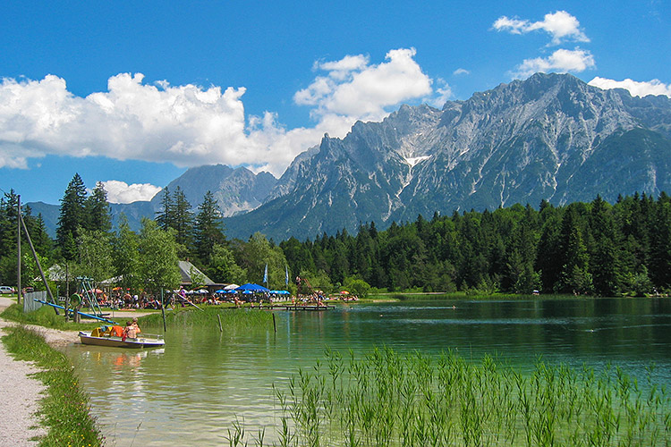 Blick auf Strandbad am Lautersee und Karwendelgebirge